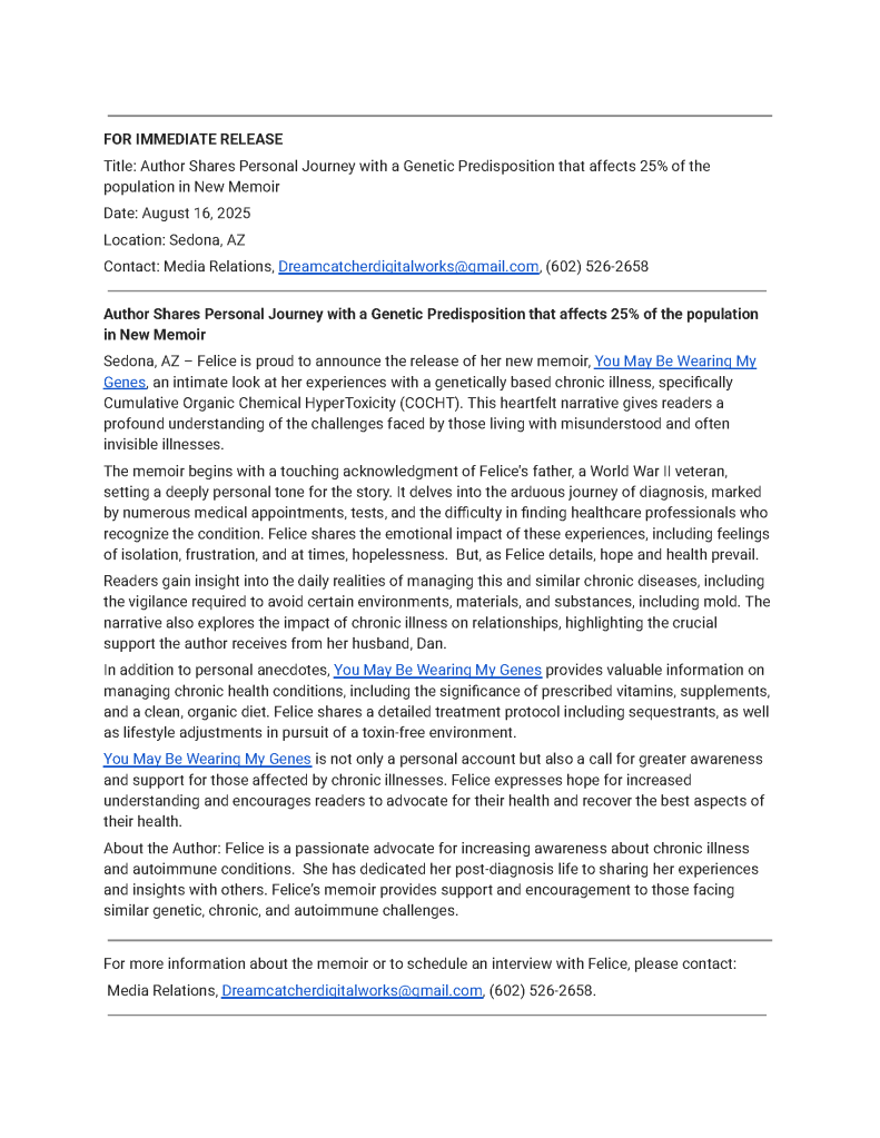 “You May Be Wearing My Genes” by Felice, with Dan J.P. Ciernia, M.Ed., is a compelling memoir that chronicles Felice’s journey of living with a genetic predisposition, a health condition known as Cumulative Organic Chemical Hypertoxicity (COCHT). This deeply personal narrative explores the challenges and triumphs of managing a resulting chronic illness that affects nearly 25% of the world’s population. Through detailed accounts of her experiences, Felice shares insights into the search for a proper diagnosis, the impact of environmental factors, the necessity of lifestyle adjustments, steadfast determination, and faith. “You May Be Wearing My Genes” is a guide for others navigating similar health journeys, emphasizing that reclaiming a healthier life is not only possible but probable. Felice’s journey is your guide to reclaiming you.
